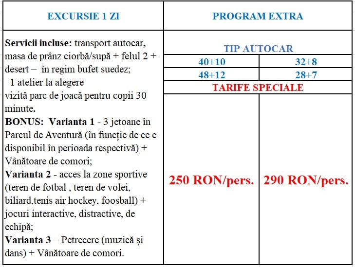 *Pentru excursiile organizate din Slatina și Arad se achită un supliment de 60 lei (autocar 50/60 locuri) respectiv 80 lei (autocar 35/40 locuri).