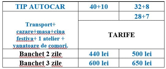 Tarifele prezentate în tabel sunt valabile pentru plecările din: Suceava, Iași, Botoșani, Bacău, Piatra Neamț, Târgu Neamț, Fălticeni și Bistrița. Pentru excursiile organizate din Cluj și Târgu Mureș se achită un supliment de 60 lei (autocar 50/60 locuri) respectiv 80 lei (autocar 35/40 locuri).