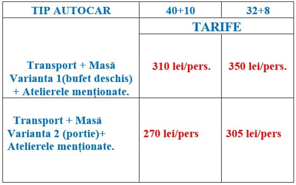 Programul se adresează grupurilor de elevi deja formate, însoțite de profesori. Adulții (părinți/bunici) care participă la excursie vor achita suplimentul de 50 lei/persoană pentru masa de prânz sau 30 lei /persoana pentru meniu fix, iar numărul acestora nu va fi mai mare de 10% din totalul grupului!