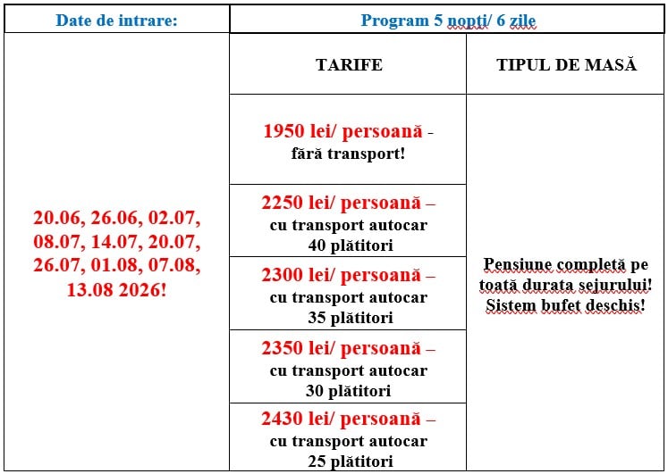 Tarifele includ un TVA de 11% la cazare și 21% la transport, și sunt valabile la momentul lansării ofertei 15.09.2025! În cazul în care, vor exista modificări de taxe și impozite, tariful se modifică/recalculează la nivelul legislației în vigoare la momentul prestării serviciilor!